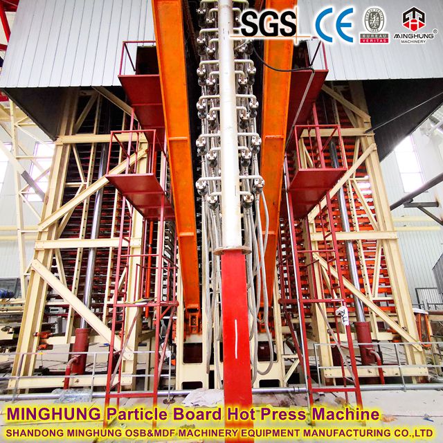 Loading: Pre-pressed MDF mats are automatically fed between each layer of hot platens by a loader.